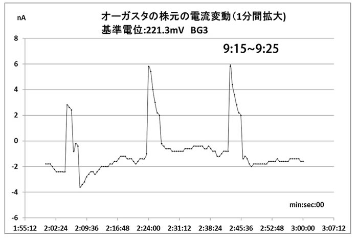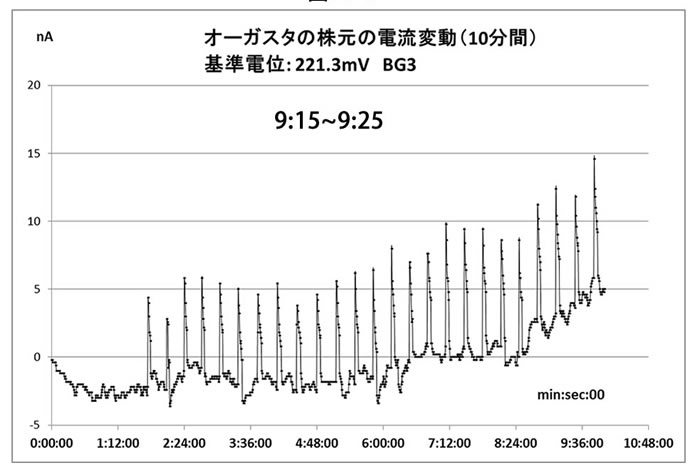 静電三法の著者である楢崎氏の残した報告では、植物波というものの存在も指摘されているが、 これは、植物の生体内に存在する、その植物の持つ固有の電気的振動のようなものであり、 これが事実なら、電極を刺せば、何がしら周期的変動電位とか変動電流のようなものが出てくるはずである。 しかし、最初の頃私がやっていた限りでは、そういうものは現れなかった。 現れていたのは直流的な電位差で、植物の二点間に電極を挿入しても、その間には数十ミリボルト、 場合によっては数百ミリボルトのオーダーの電圧が出てくるだけだった。 長い間、こういう計測を続ける中で、私は、ある時に、特殊な電位の計測法を編み出した。 簡単に言うと、ブリッジを使うやり方で、もし植物の二点間に30mVの電位差があったとすると、 この30mVの電位を二本の電極の間に外部的に作ってやる。 そうすると、電流は流れなくなる。 電流が流れるときは、植物の電位が30mVから変化したときだけで、 これは、通常は、非常に小さな電流である。 電極にバイアスをかけて、ベースの直流分を除去して、変化分だけを取り出せるようにするということである。 そして、この工夫をした結果、新たな世界が開けてきたのである。 ナノアンペアの電流の変化をとらえることができるようになったのである。