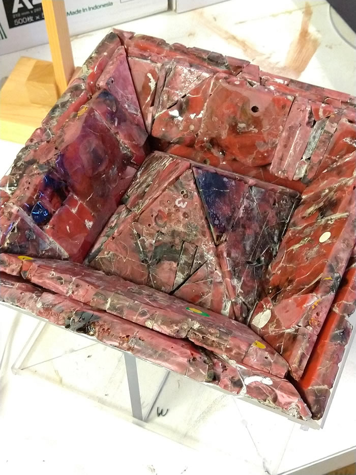 このピラミッドは四角推の底辺が上の方にあり、一辺の長さが二十三センチになっている。 最初は二十四センチで作っていたのだが、形を整形しているうちに、 いつの間にか少しずつ小さくなってしまったようである。 あるとき、Hさんに、エジプトのギザの大ピラミッドは一辺が二三〇メートルあり、 二十三センチというのは、ちょうどその千分の一の大きさだと言われた。 それで、サイズをよくよく測ってみたら、二十三センチだということが分かった。 それと、これも以前に作っていたちょうど半分のサイズのピラミッドがあって、 これは底辺を十二センチで作ったもので、これも逆ピラミッドとして作ったものであった。 サイズを測ってみたら、一辺が十二センチはなくて十一・五センチしかないことに気づいた。 それだと、二十三センチのちょうど半分ということになる。 逆ピラミッドの場合は、アクリルの逆ピラミッドの台の上に、 セラミックのタイルをおいていくだけだったが、正ピラミッドにするには、 正ピラミッド用の台を作らないといけない。 もう一つのやり方は、側面の三角形のタイルを一枚にすることで、 四枚の側面のタイルにすれば、自立してピラミッドが立ち上がる。 そこで、それまでのタイルを接着剤で固定して、一体型の側面のタイルを作った。 もう一つは、この側面のパネルの稜線の内側の角度が重要で、 これを正確に合わせないとピラミッドにならない。だから研磨をして微調整を行った。 そうして、このピラミッドが出来上がったのである。